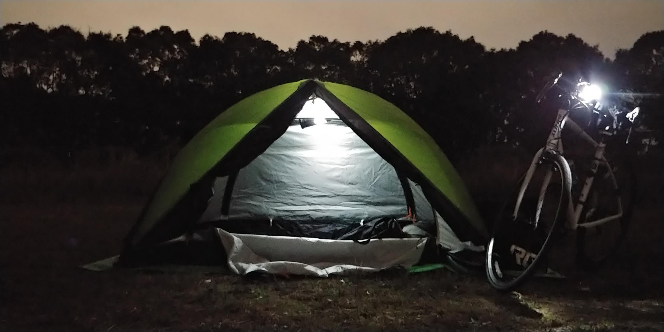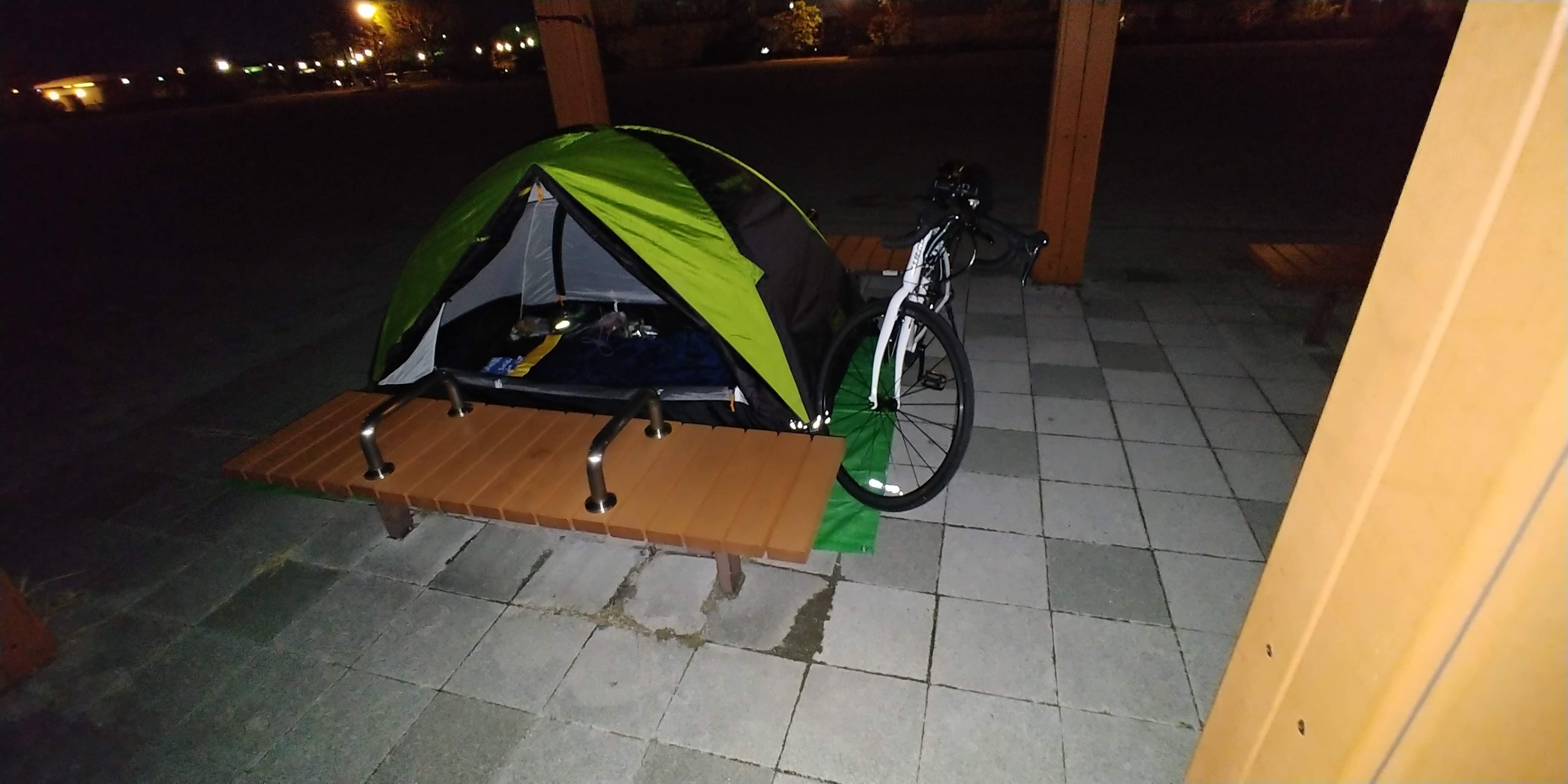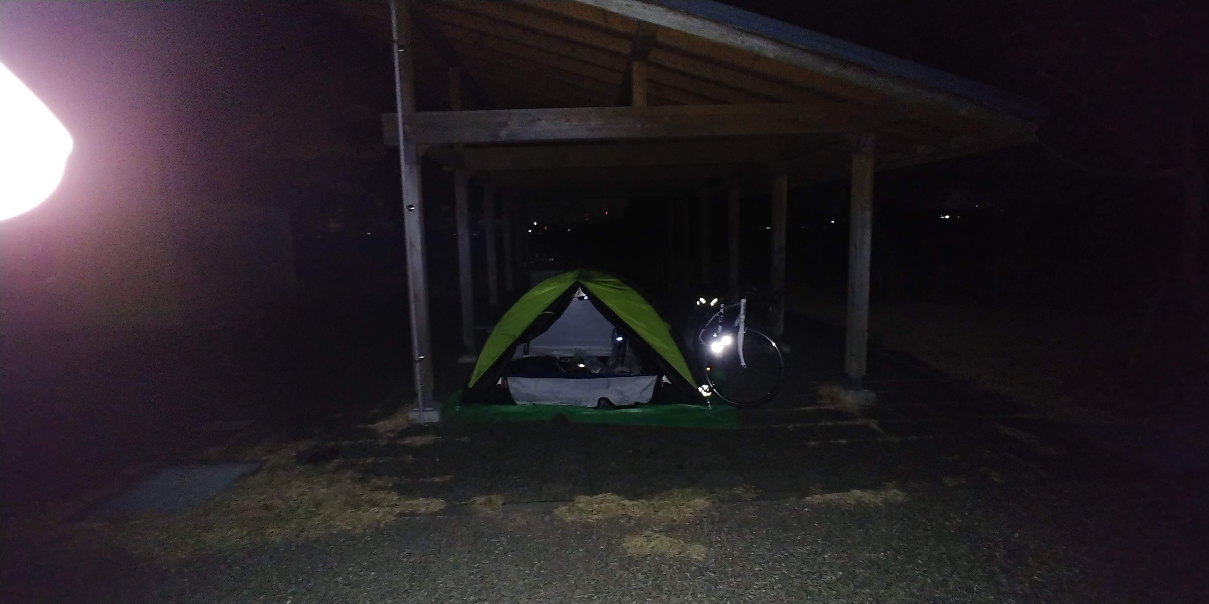 そしてこの日の寝床探しで一苦労.予定していた公立公園が17時で閉園とのことで使用することができなかった.そのため少し進んだところにある運動公園を利用することにした.次の日は雨の予報であったため,東屋の下にテントを張り就寝.風で飛ばないように&盗難防止のため,自転車とテントを鍵で繋いでいる.