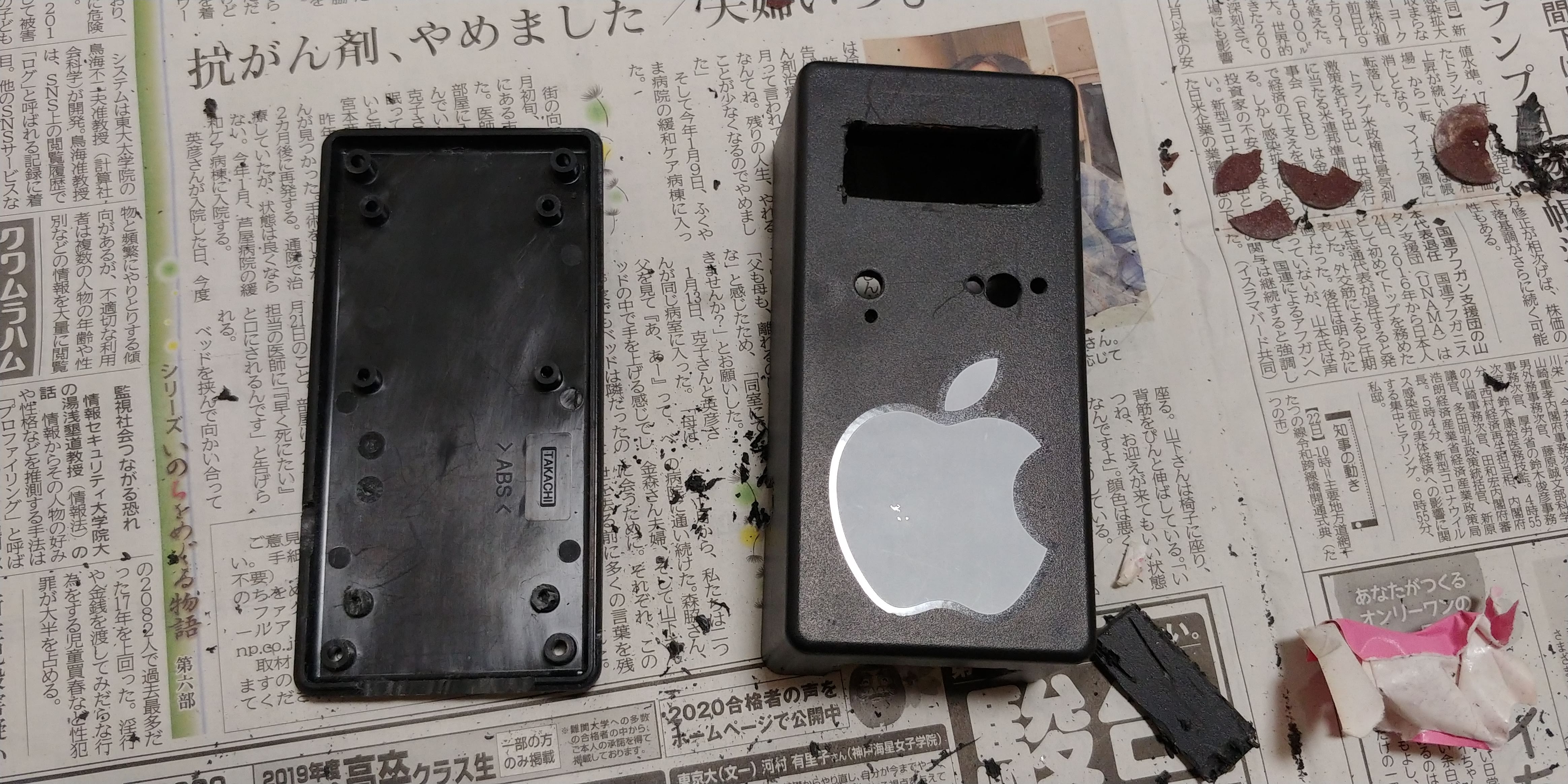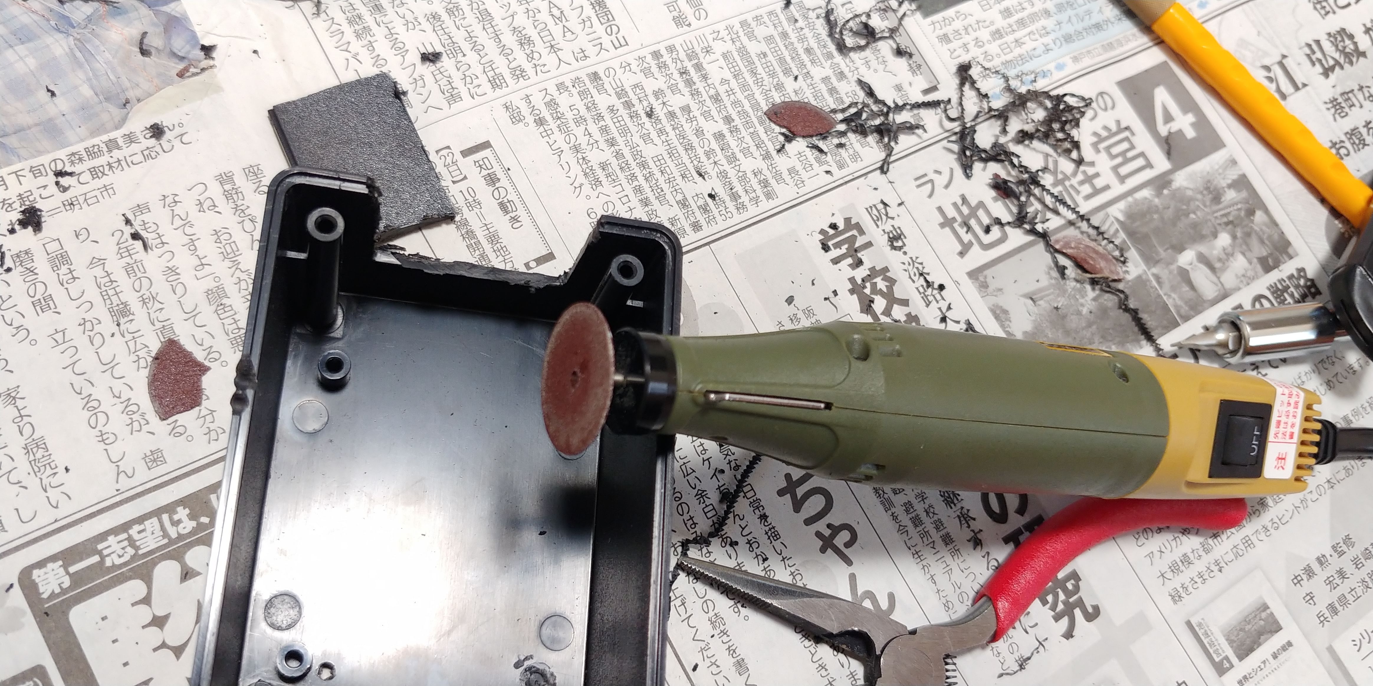 筐体の加工.黒いプラスチックの箱をシリコンハウスで買ってきた.シリコンハウスに売っている箱はいろんな色や大きさがあり使いやすい.問題は工具である.コロナで学校に行けないため部室の工具が使えない.家にあるリーマーを使うことにした.