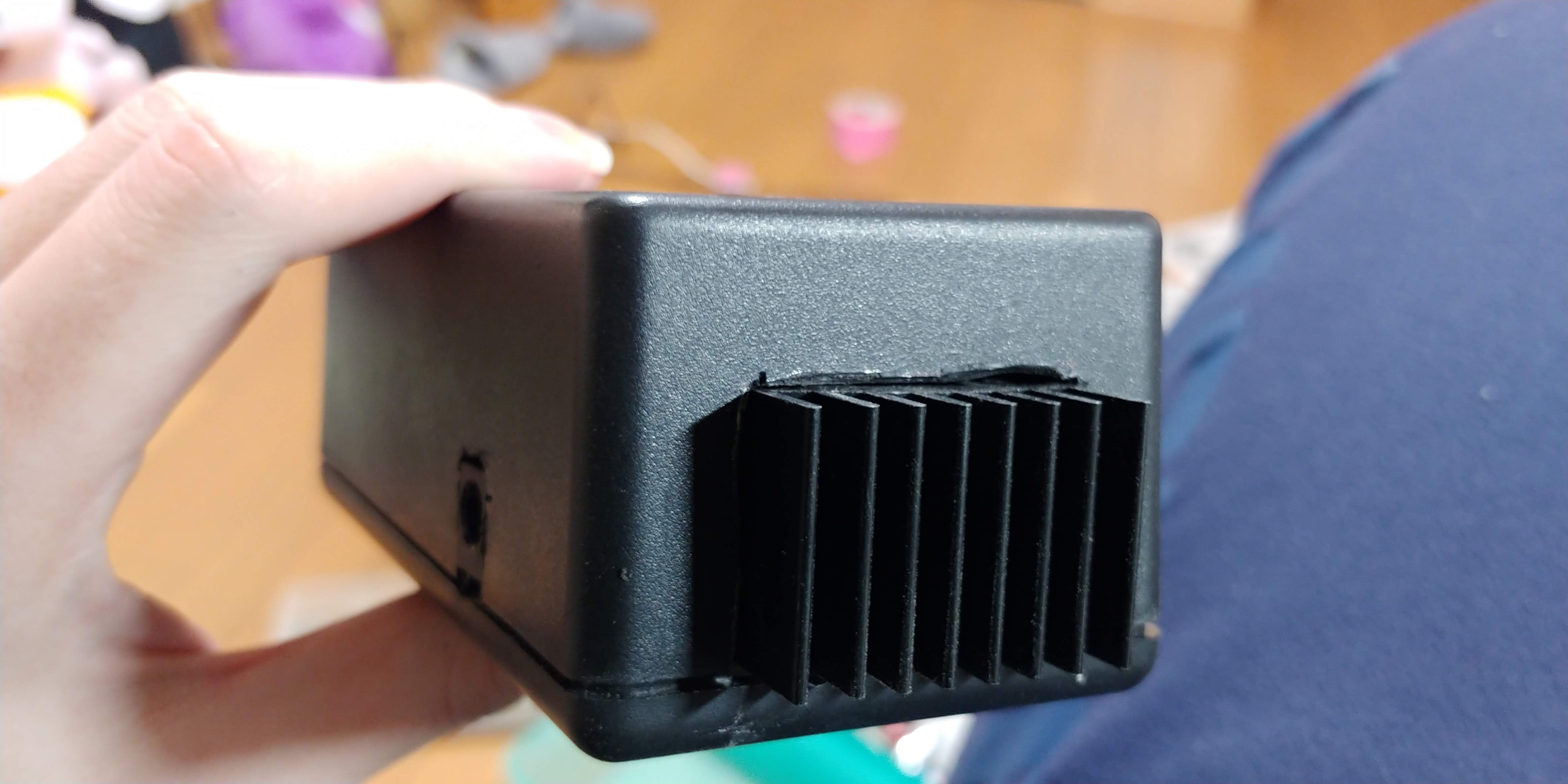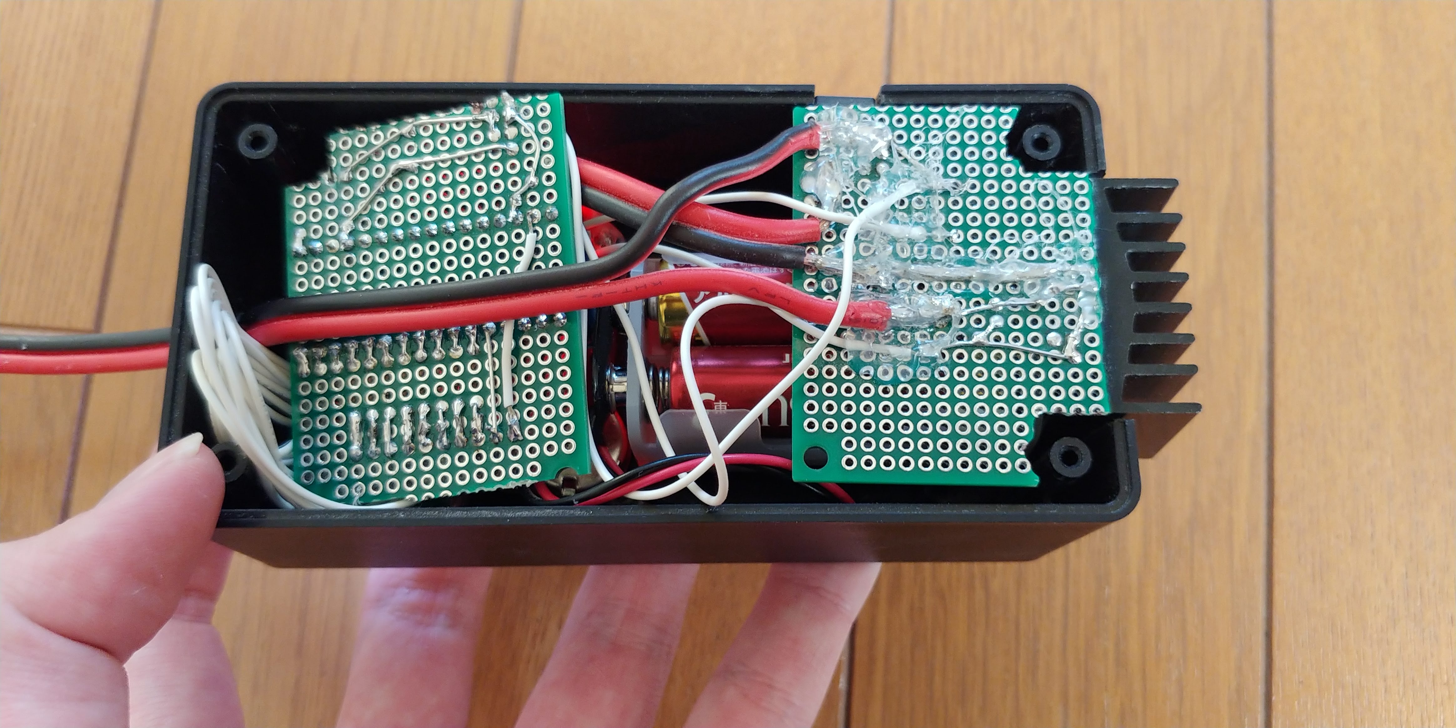 筐体に詰め込む.思ったよりパンパンで上手く入れるのが難しい.とにかくショートしないようにグルーガンで埋めた.