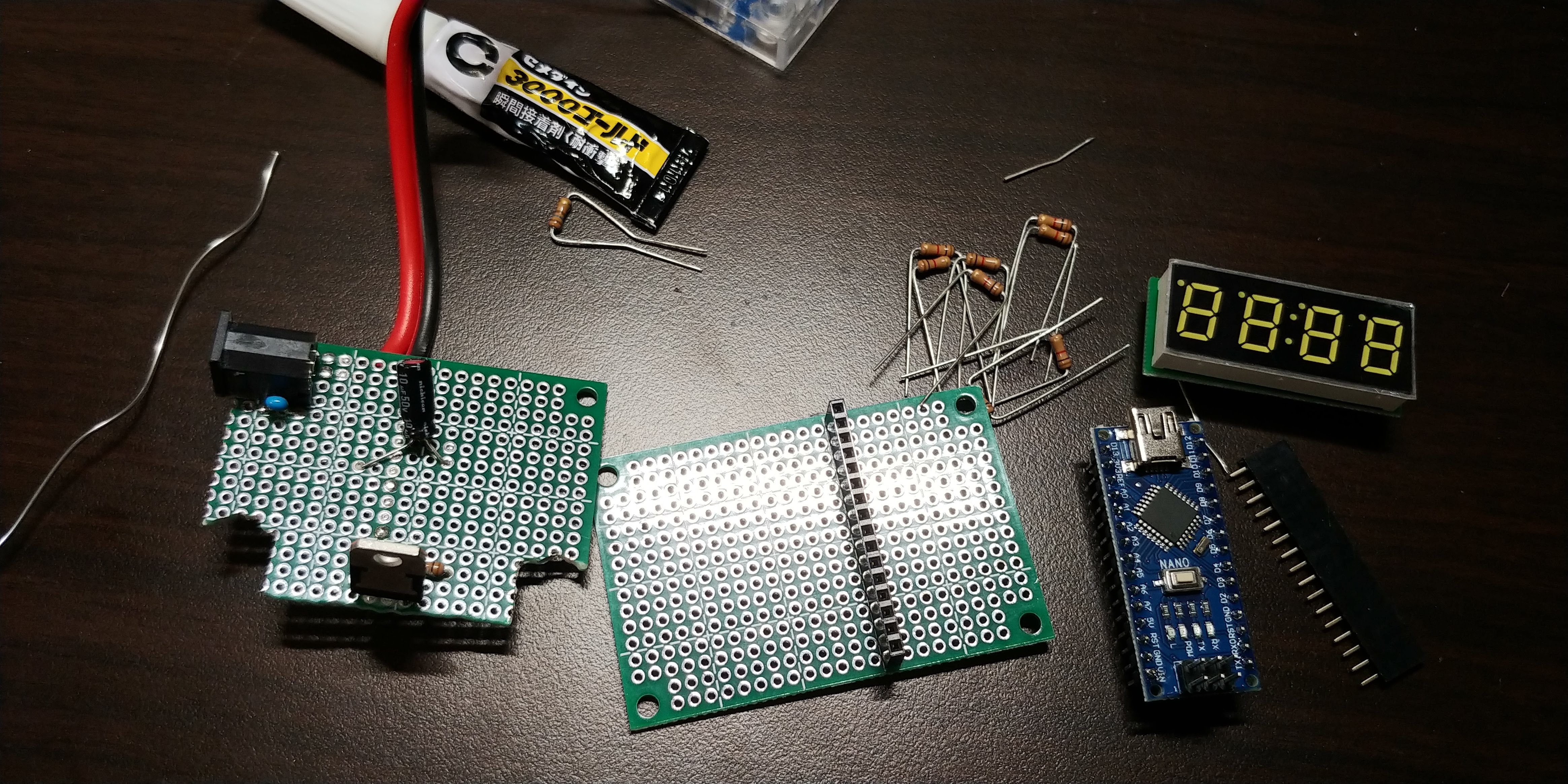 回路を組んで,基板にはんだ付け.マイコンは一度書き込んだらもうそれっきりなので直接つけた.