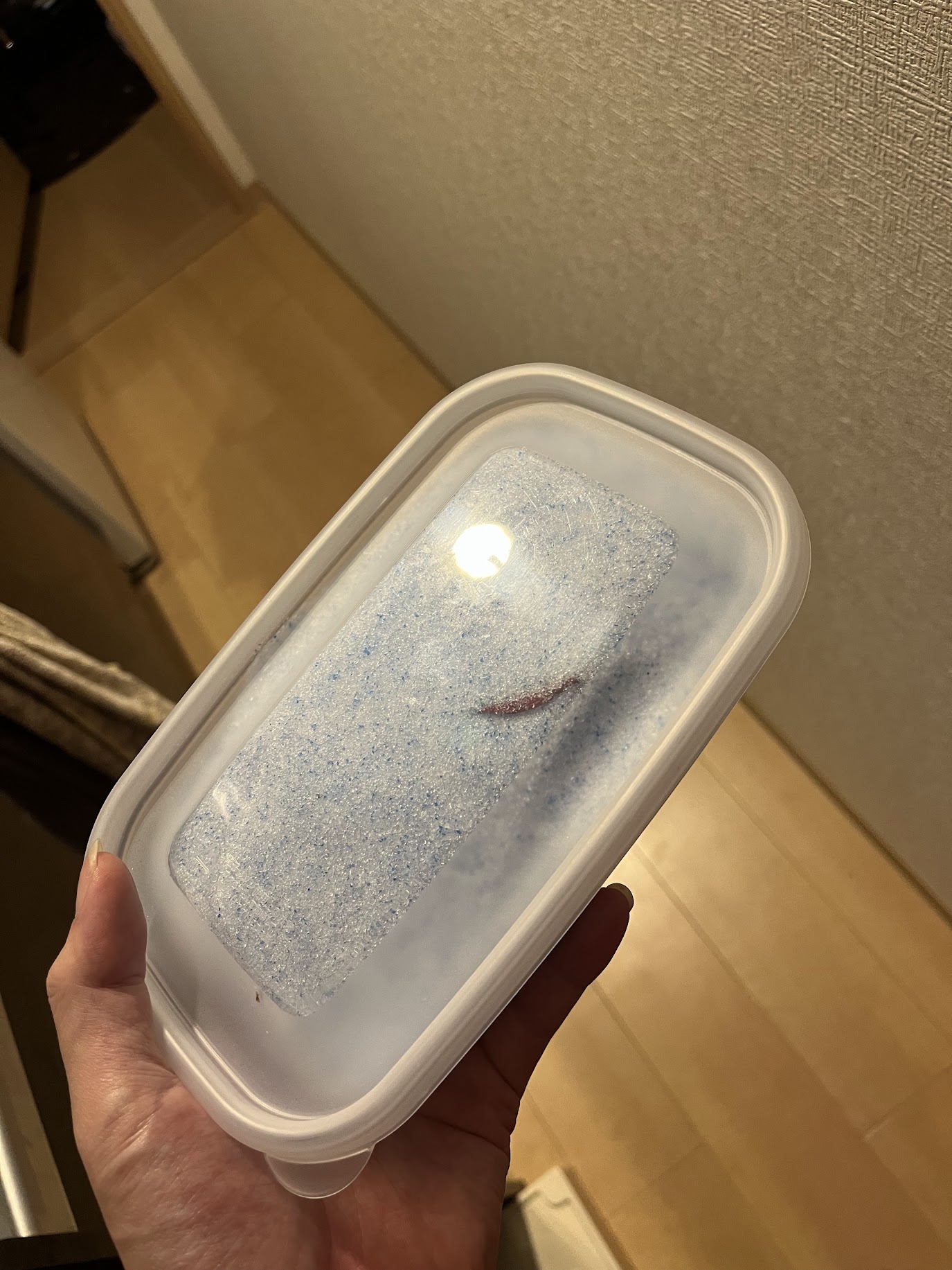 バラを茎の根元で切断し,密封する容器にシリカゲルで埋める.やった後で気づいたが,バラを寝かせて入れるとシリカゲルの重みで鼻が歪んでしまった.するなら縦向きでやった方がよい.