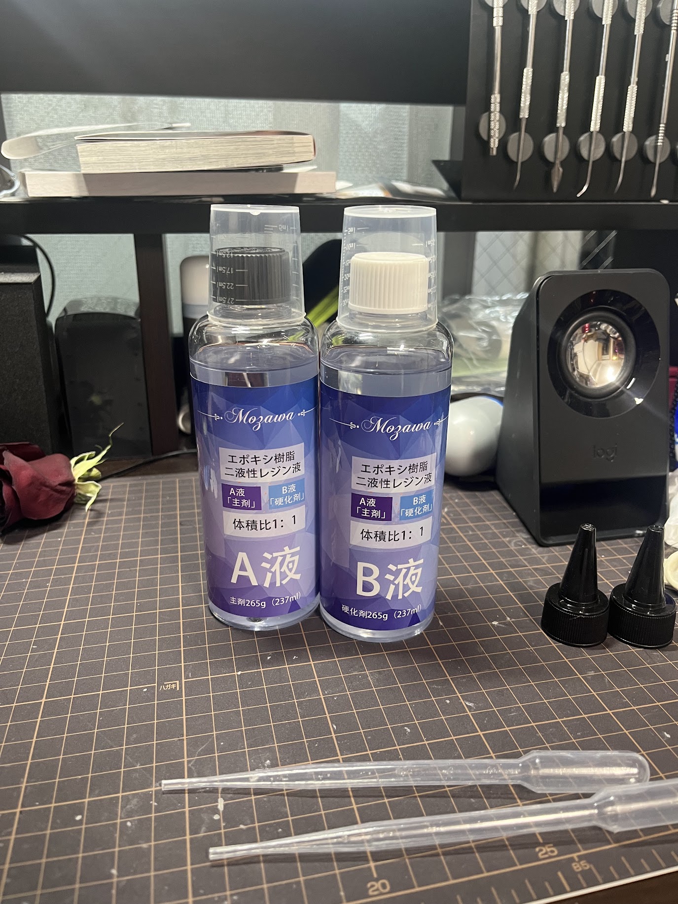 エポキシ樹脂はAmazonで2000円前後で販売されている.実は一度失敗したため2回購入したのだが,別の販売者の商品を購入したがラベルのデザインが違うだけでボトルや付属品は全くおなじであったためエポキシ樹脂で検索して一番安い商品を購入すればよいと思われる.