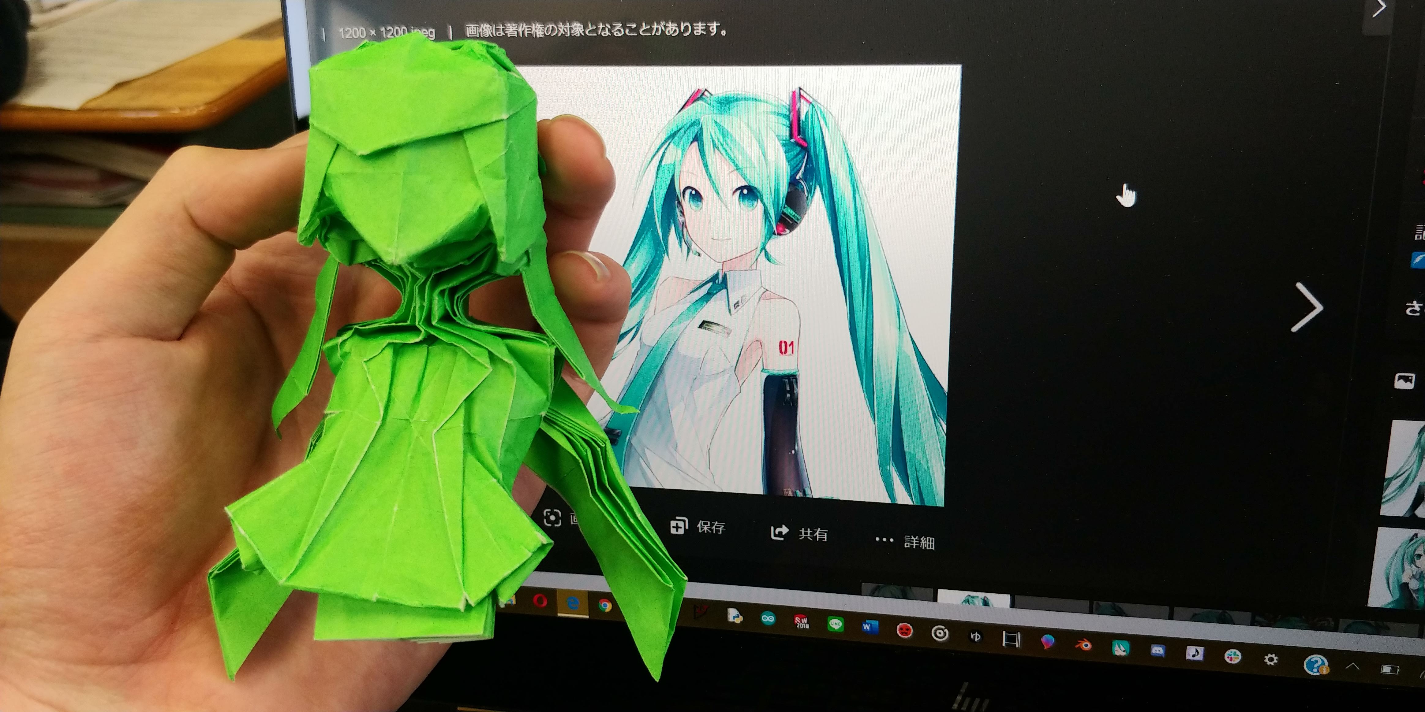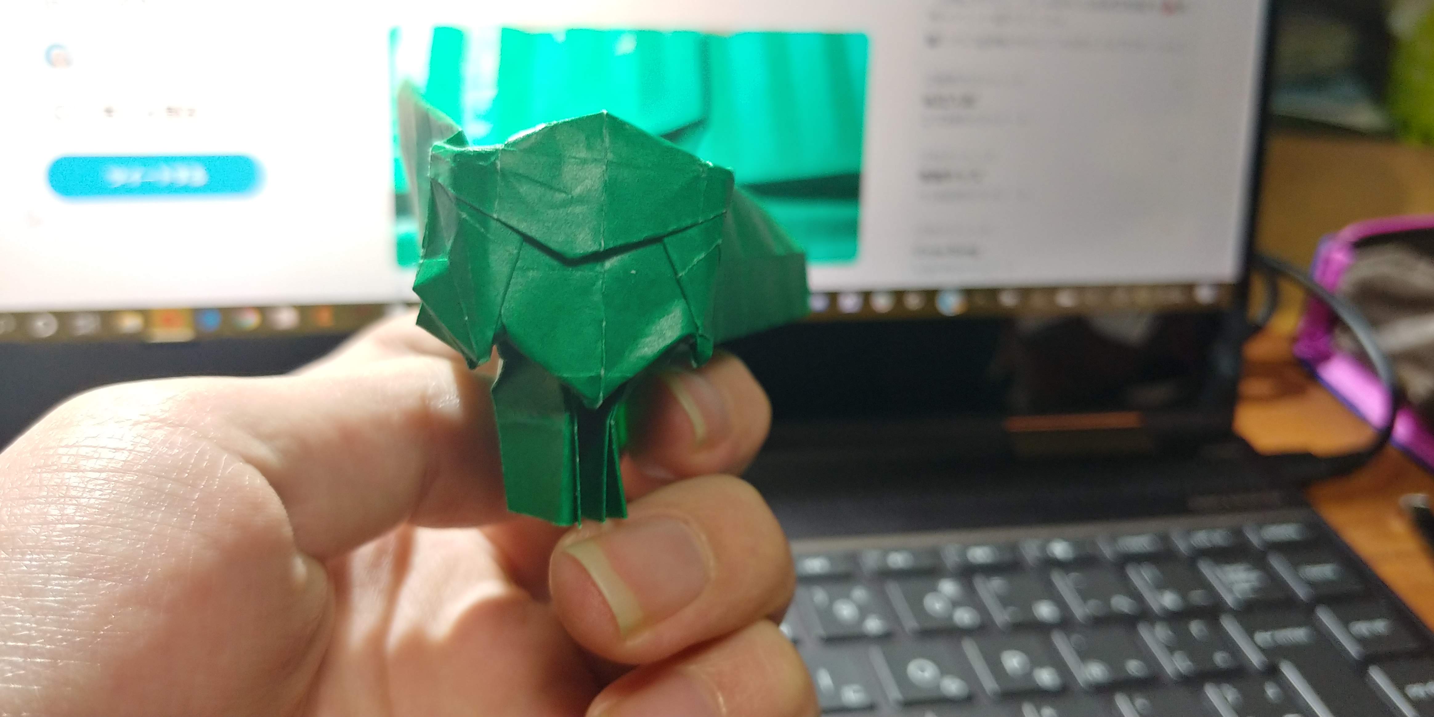 いじってるとこんなのが折れた.前髪と横の髪が上手いこと出てて,いい感じだ.このまま畳んで顔っぽくしてみる.